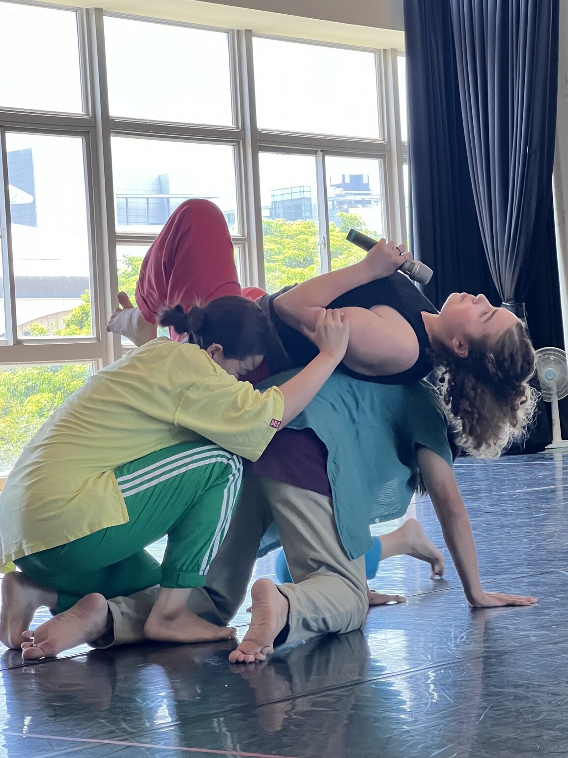 The choreography process of each work involved a lot of communication, and each dance intends to communicate the choreographer’s ideas about certain issues. In TUNG I-Fen’s work, My Body, My Hisotory--States of Being, all dancers have to talk to a microphone. During the rehearsal, dancers expressed high interests in speaking to a microphone. It seemed that the microphone was like a wane of power. Whoever held the microphone looked empowered and often acted with a sense of playfulness. I-Fen also instructed dancers to play with rhythms, sounds, intonations, or ways of holding the microphone so that the audience would feel they really wanted to say something and they meant it. The rehearsal could turn more adventurous when I-Fen guided the dancers to find ways to speak in any awkward positions or on-going motions. It could develop into a hilarious scene when a dancer is held by other dancers, effortlessly rolling and flipping up and down in the air or over another dancer’s body as if the microphone holder or human carriers were supposed to be invisible.